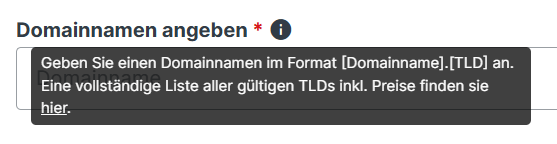 Hinweis: Klick auf das Info-Zeichen, um die komplette Liste der gültigen Top-Level-Domains und deren Preise zu sehen.