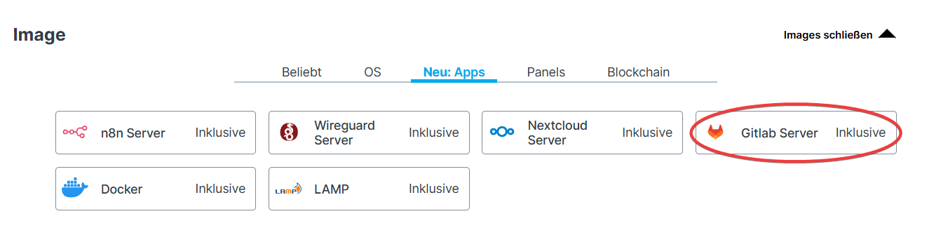 3. Scroll runter zu "Image" und klick auf "Neu: Apps", dann wähl dort "GitLab Server" aus.