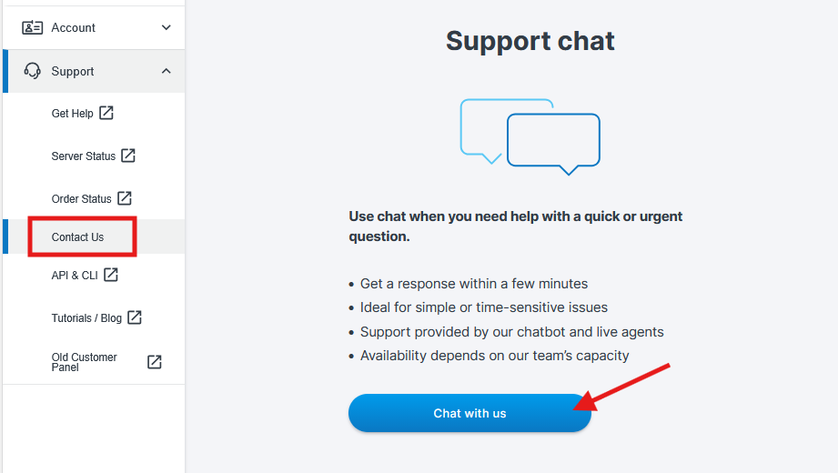 - In the Contact Us section of the Customer Panel, click Chat with Us.